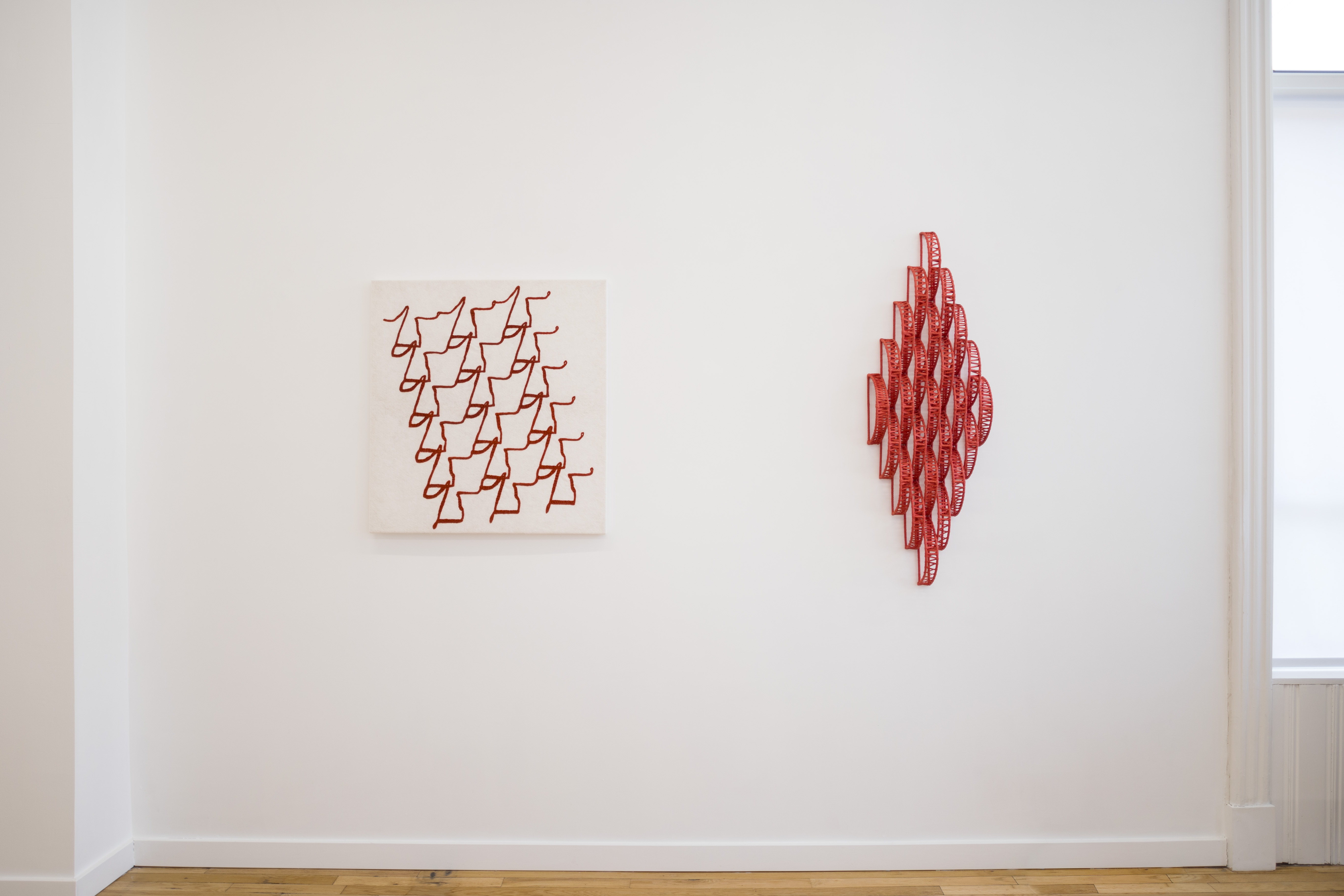 Two large wall-relief sculptures, Working Meditation I and Working Meditation II, are inspired by the structures of Chimayo and Rio Grande weaving styles, a visual language that formed as a result of a unique aesthetic mixture of the Indigenous, Mexican, and Spanish presences in New Mexico. In Knowing Way, Martínez hand-coils and weaves natural reed fibers into undulating forms and again in the two stretched embroideries known as Colcha bordado, a form of embroidery born in what is now New Mexico. Martínez breathes new life into these historical forms of labor, leaning into the poetic translation of labor as a way to ultimately find her way home.